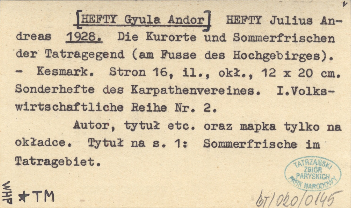 Kesmark (Sonderhefte des Karpathenvereines. I.Volkswirtschaftliche Reihe ; 2) , 16 s., il., okł., 12x20 cm. Autor, tytuł etc. oraz mapka tylko na okładce. Tytuł na S. 1: Sommerfrische im Tatragebiet.