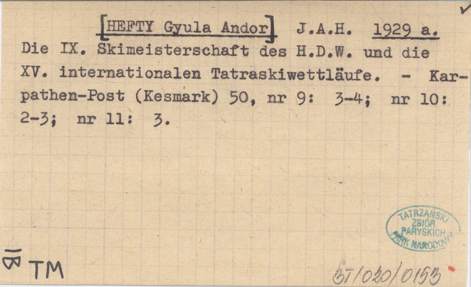 J. A. H. [HEFTY Gyula Andor] 1929 a Die IX. Skimeisterschaft des H.D.W. und die XV. internationalen Tatraskiwettläufe.
