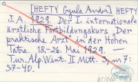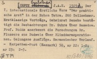 J. A. H. [HEFTY Gyula Andor] 1929 d Der I. internationale ärztliche Kurs "Der praktische Arzt" in der Hohen Tatra. 260 Teilnehmer. Erstklassige Vorträge. Geheimrat Beneke bestätigt die Beobachtungen Dr. Guhrs über Basedow. Prof. Budde anerkennt die Forschungen Dr. Flussere aus Budweis über Blinddarmoperationen. Gelungene Ausflüge. Harmobischer Verlauf.