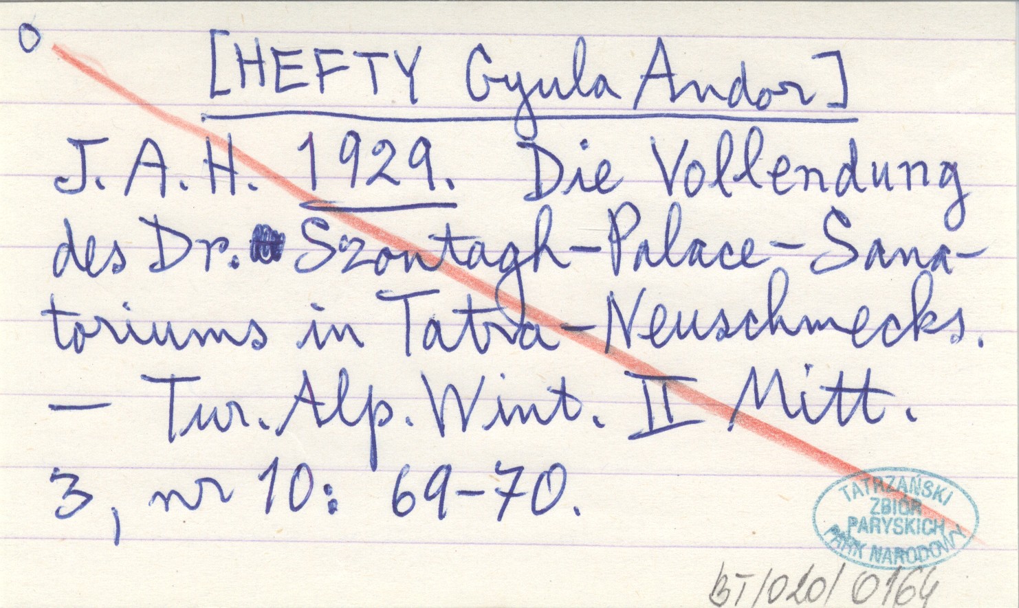 J. A. H. [HEFTY Gyula Andor] 1929 Die Vollendung des Dr. Szontagh-Palace-Sanatoriums in Tatra-Neuschmecks.