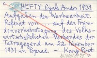 HEFTY Gyula Andor 1931 Aufgaben der Werbearbeit. Referat von ... auf der Fremdenverkehrstagung des Volkswirtschaftlichen am 22. November 1931 in Poprad.