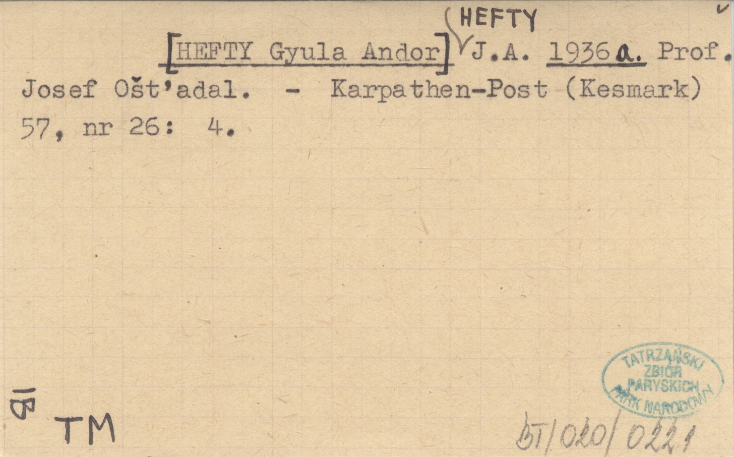 HEFTY J. A. [HEFTY Gyula Andor] 1936 a Prof. Josef Ošťadal.