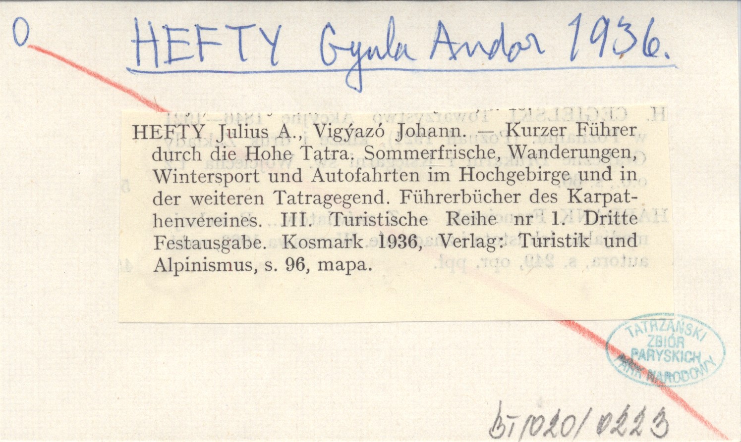 HEFTY Julius A. HEFTY Gyula Andor Vigýazó, Johann. ; 1936 Kurzer Führer durch die Hohe Tatra. Sommerfrische, Wanderungen, Wintersport und Autofahrten im Hochgebirge und in der weiteren Tatragegend. Führerbücher des Karpathenvereines. III. Turistiche Reihe nr 1. Dritte Festausgabe. Kosmark 1936.