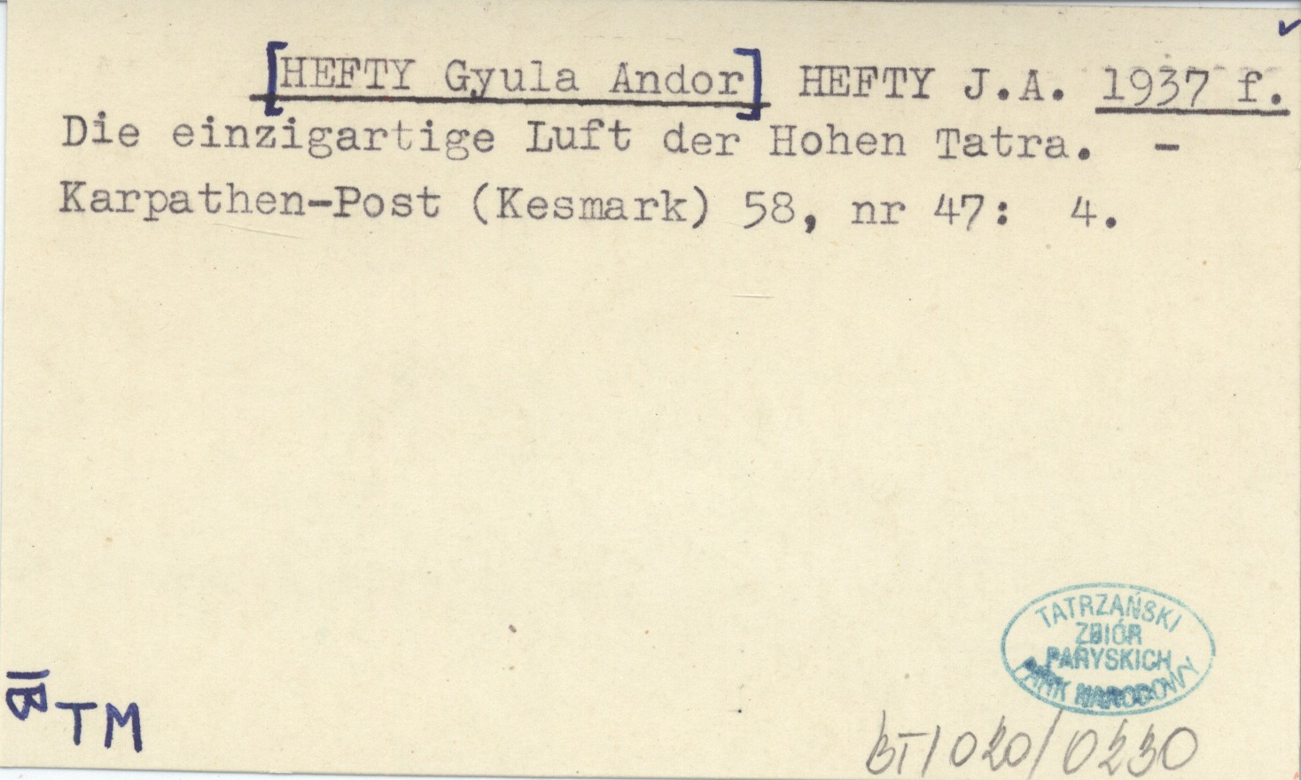 HEFTY J. A. [HEFTY Gyula Andor] 1937 f Die einzigartige Luft der Hohen Tatra.