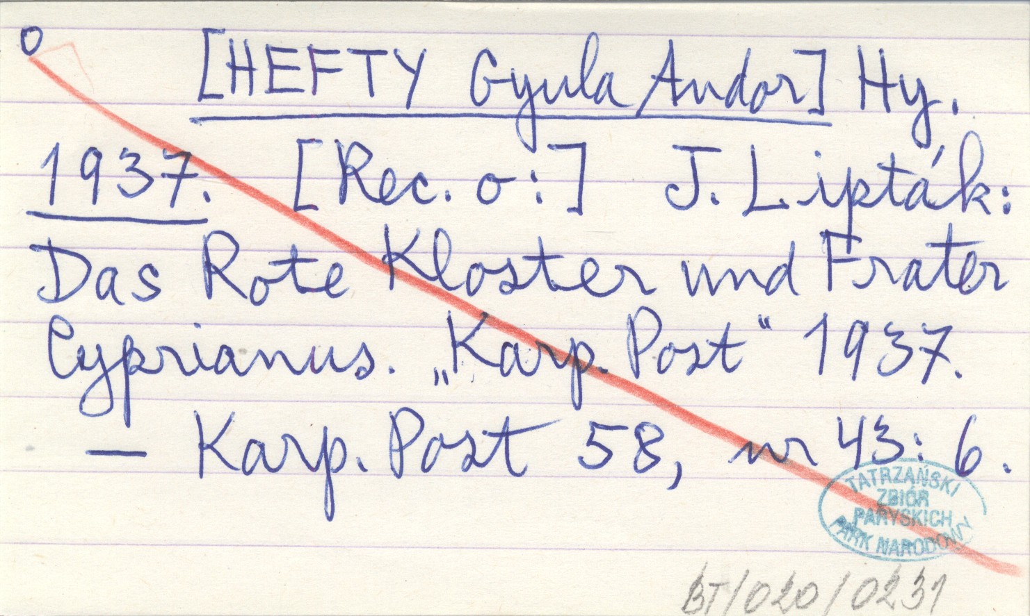 Hy. [HEFTY Gyula Andor] 1937 [Rec. o:] J. Lipsták: Das Rote Kloster und Frater Cyprianus. "Karpathen-Post" 1937.