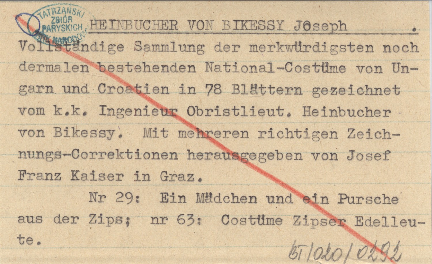 HEINBUCHER VON BIKESSY Joseph Vollständige Sammlung der merkwürdigsten noch dermalen bestehenden National-Costüme von Ungarn und Croatien in 78 Blättern gezeichnet vom k.k. Ingenieur Obristlieut. Heinbucher von Bikessy. Mit mehreren richtigen Zeichnungs-Correktionen herausgegeben von Josef Franz Kaiser in Graz.