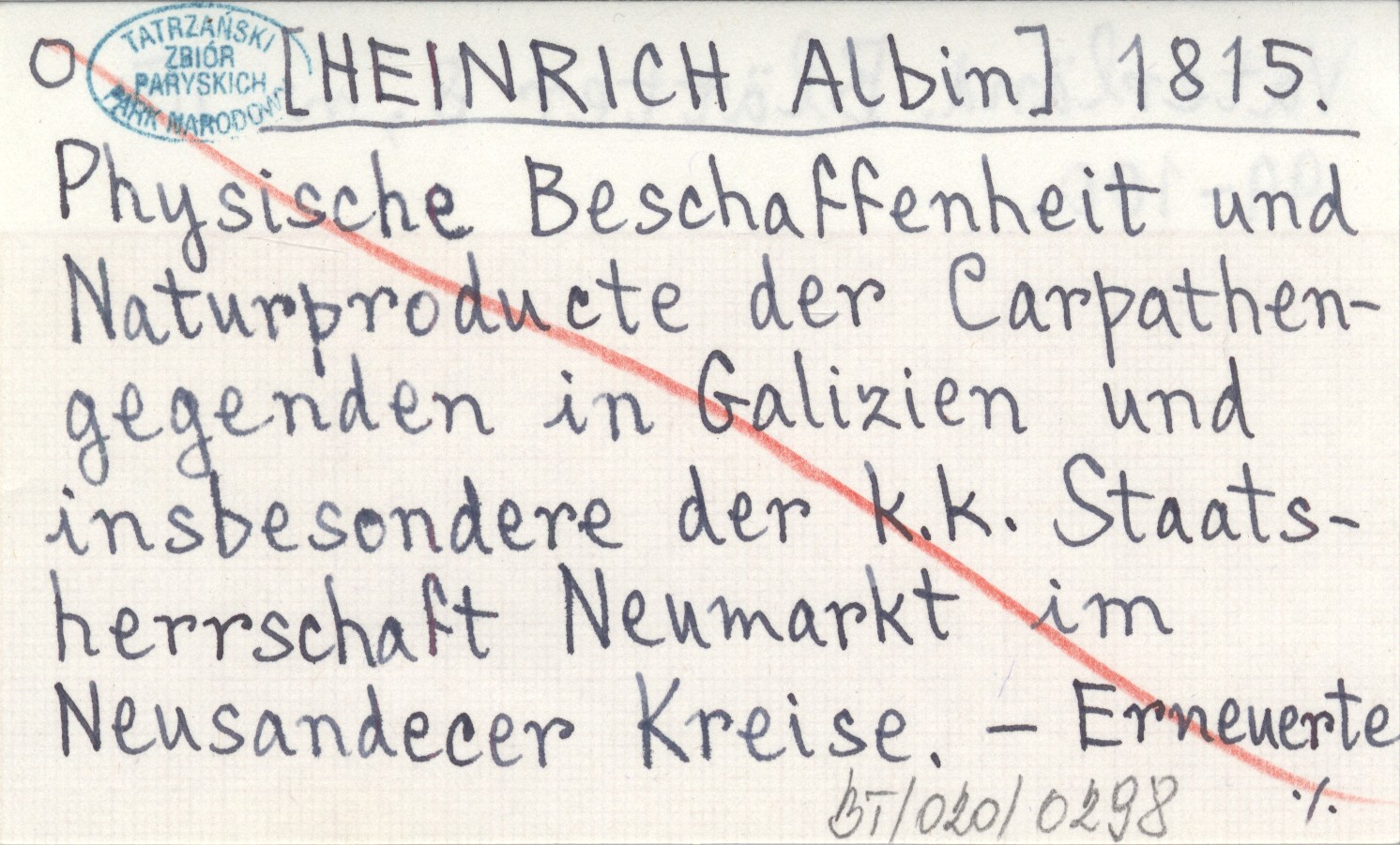 [HEINRICH Albin] 1815 Physische Beschaffenheit und Naturproducte der Carpathengegenden in Galizien und insbesondere der k.k. Staatsherrschaft Neumarkt im Neusandecer Kreise.