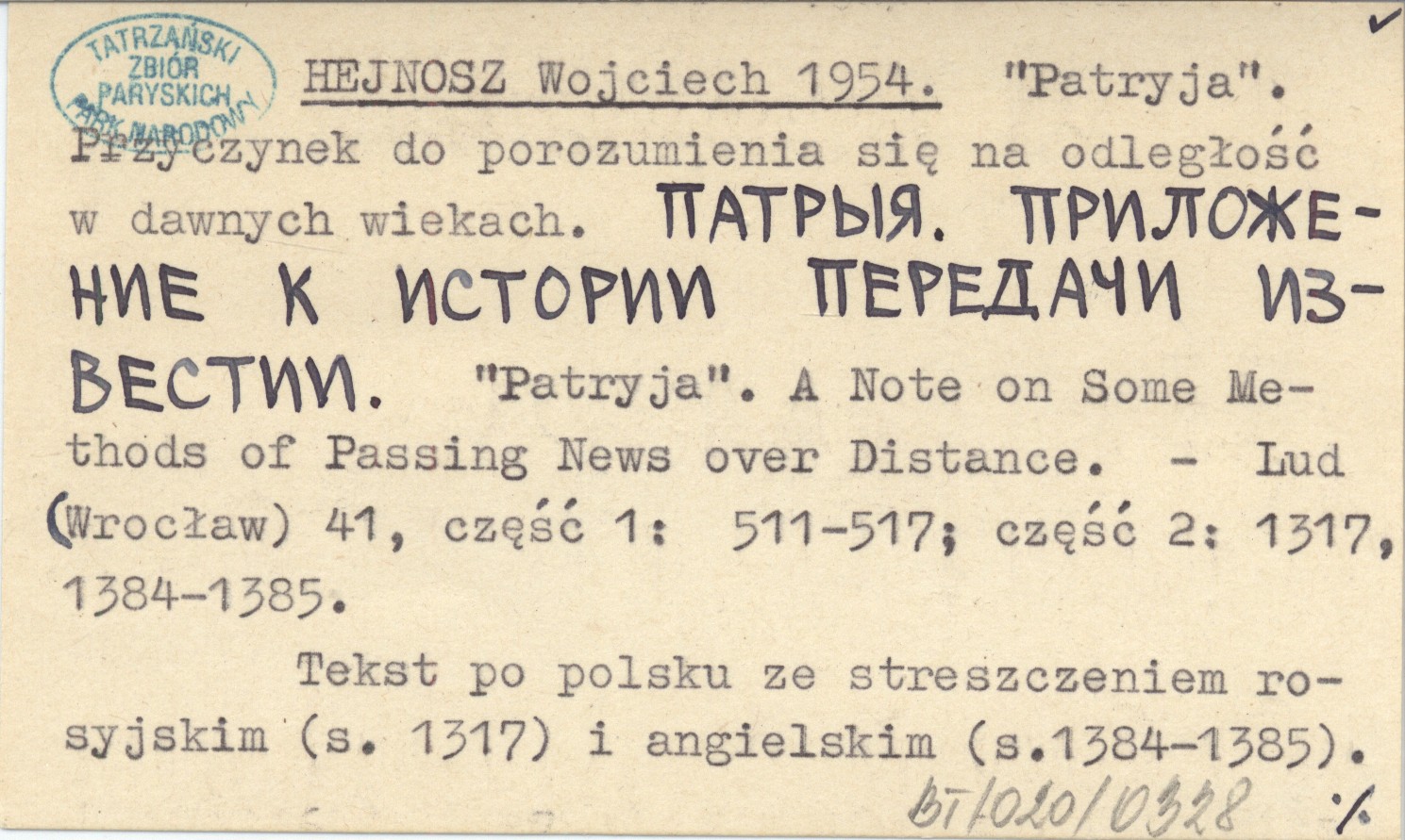 HEJNOSZ Wojciech 1954 "Patryja". Przyczynek do porozumienia się na odległość w dawnych wiekach. "Partyja". Vklad v dogovore na rasstoyanii v proshlykh vekakh. "Patryja". A Note on Some Methods of Passing News over Distance.