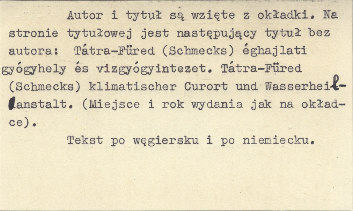 Bécs ; Budapest ; Lipcse ; Wien ; Pest ; Leipzig , 32 s., il., okł. (il.), 16x24 cm. Autor i tytuł s± wzięte z okładki. Na stronie tytułowej jest następuj±cy tytuł bez autora: Tátra-Füred (Schmecks) éghajlati gyógyhely és vizgyógyintezet. Tátra-Füred (Schmecks) klimatischer Curort und Wasserheilanstalt. (Miejsce i rok wydania jak na okładce). Tekst po węgiersku i po niemiecku.