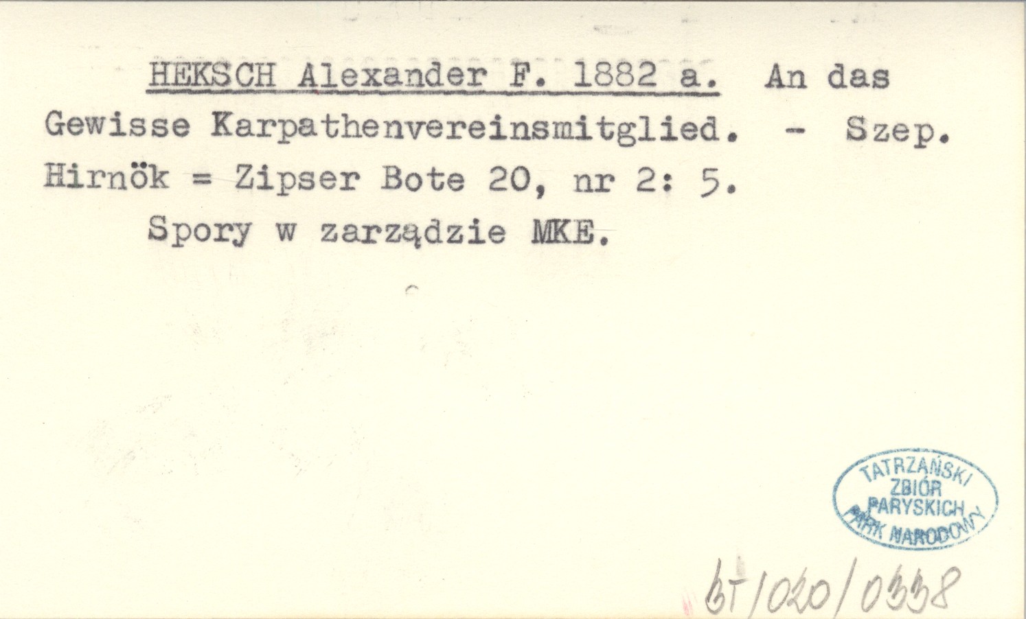 HEKSCH Alexander F. 1882 a An das Gewisse Karpathenvereinsmitglied.