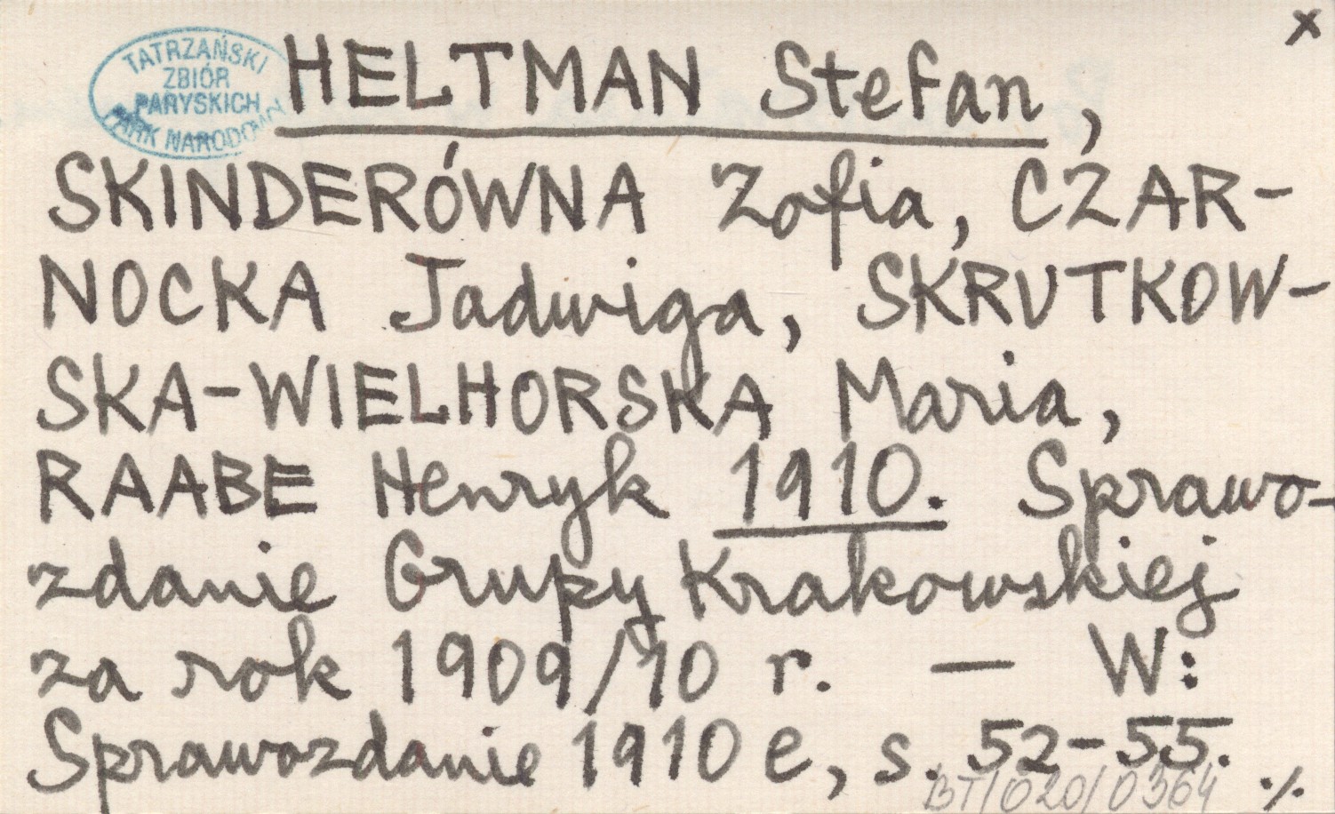 HELTMAN Stefan SKINDERÓWNA, Zofia. ; CZARNOCKA, Jadwiga. ; SKRUTKOWSKA-WIELHORSKA, Maria. ; RAABE, Henryk. ; 1910 Sprawozdanie Grupy Krakowskiej za rok 1909/10 r.