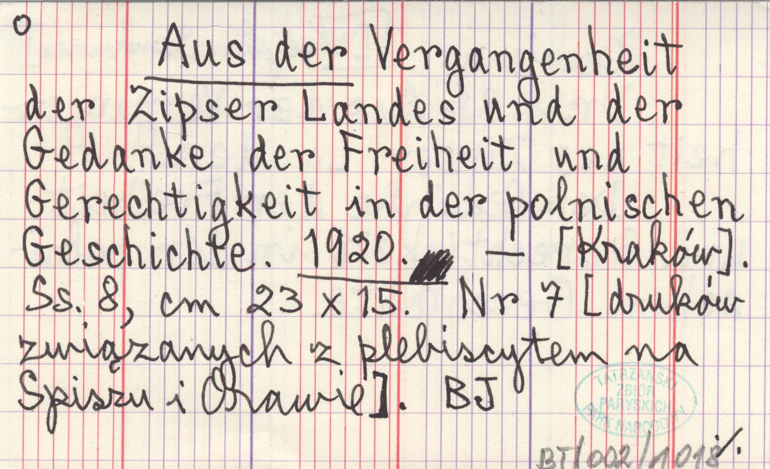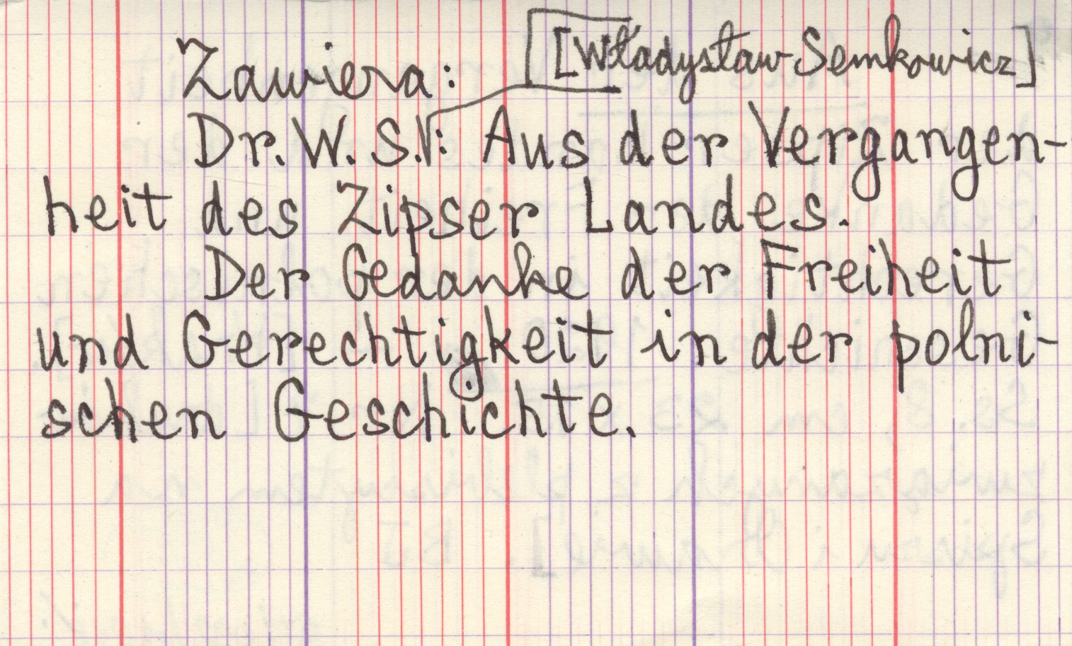 [Kraków] , Nr 7, 8 s., 23x15 cm. [Druki związane z plebiscytem na Spiszu i Orawie]. Zawiera: Dr. Władysław Semkowicz: Aus der Vergangenheit des Zipser Landes. Der Gedanke der Freiheit und Gerechtigkeit in der polnischen Geschichte.