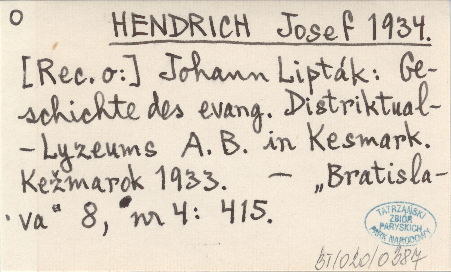 HENDRICH Josef 1934 Johann Lipták: Geschochte des evang. Distriktual-Lyzeums A. B. in Kesmark. Kežmark 1933.