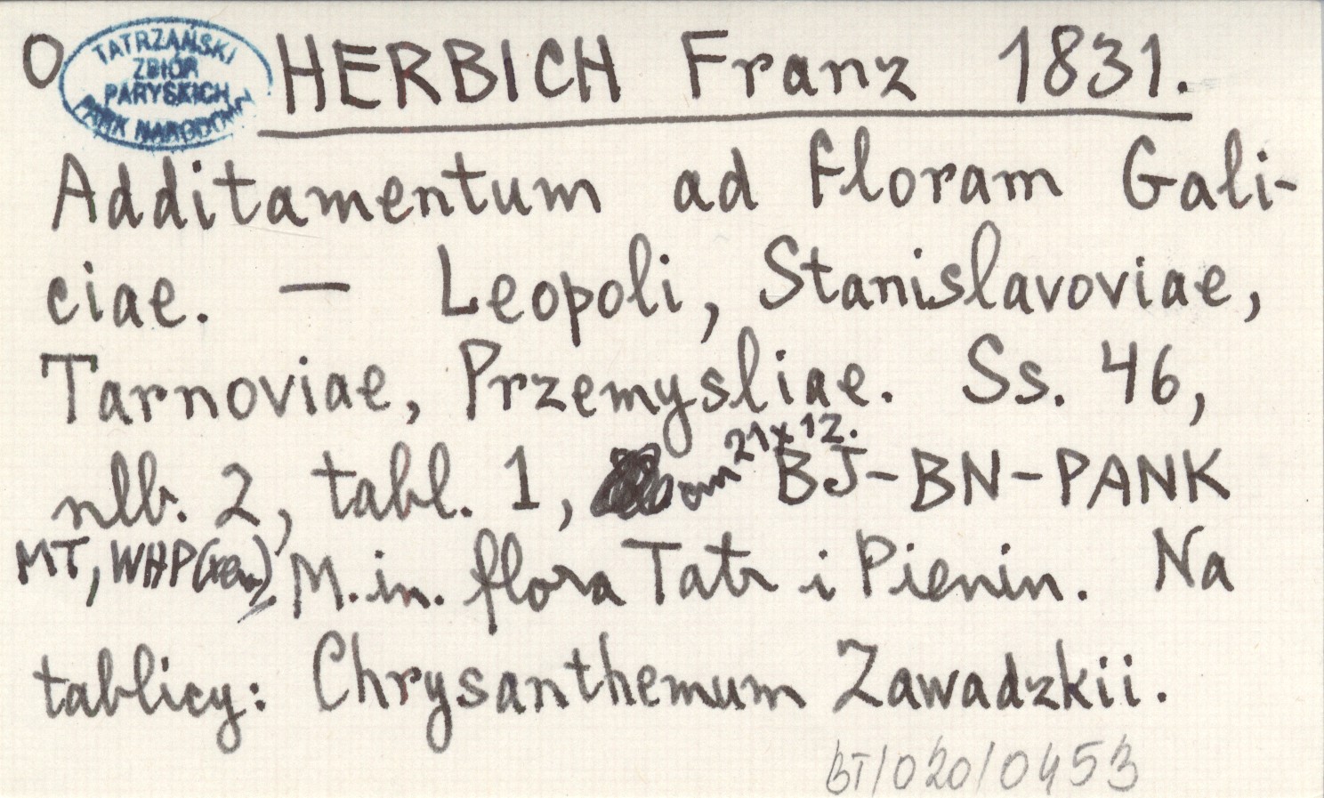Leopoli ; Stanislavoviae ; Tarnoviae ; Przemysliae ; , 46 s., [2], 1 k., 21x12 cm. M. in. flora Tatr i Pienin. Na tablicy: Chrysanthemum Zawadzkii.