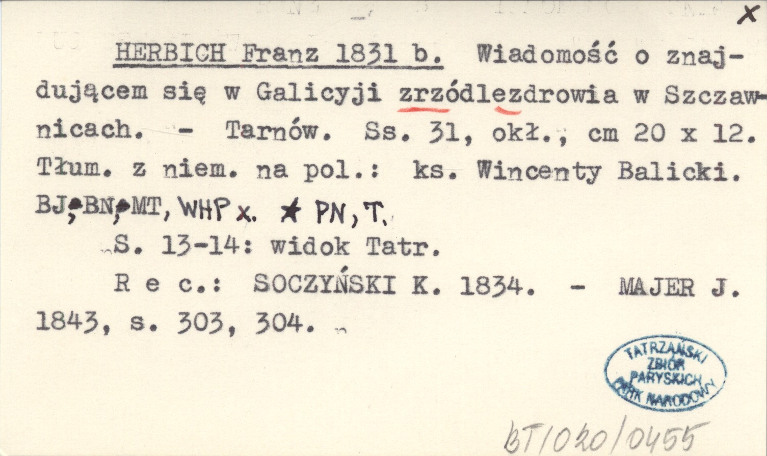 Tarnów , 31 s., okł., 20x12 cm. S. 13-14: widok Tatr. Tłum. z niem. na pol.: ks. Wincenty Balicki. REC: SOCZYŃSKI K. 1834. MAJER J. 1843, S. 303, 304.