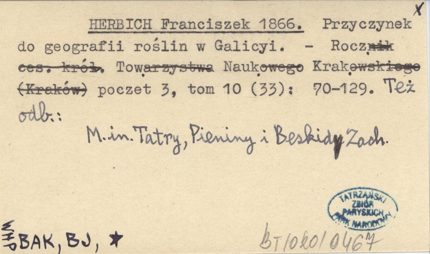 Rocznik towarzystwa Naukowego Krakowskiego, Poczet 3, t. 10 (33): 70-129. M. in. Tatry, Pieniny i Beskid Zachodni. Też odb.