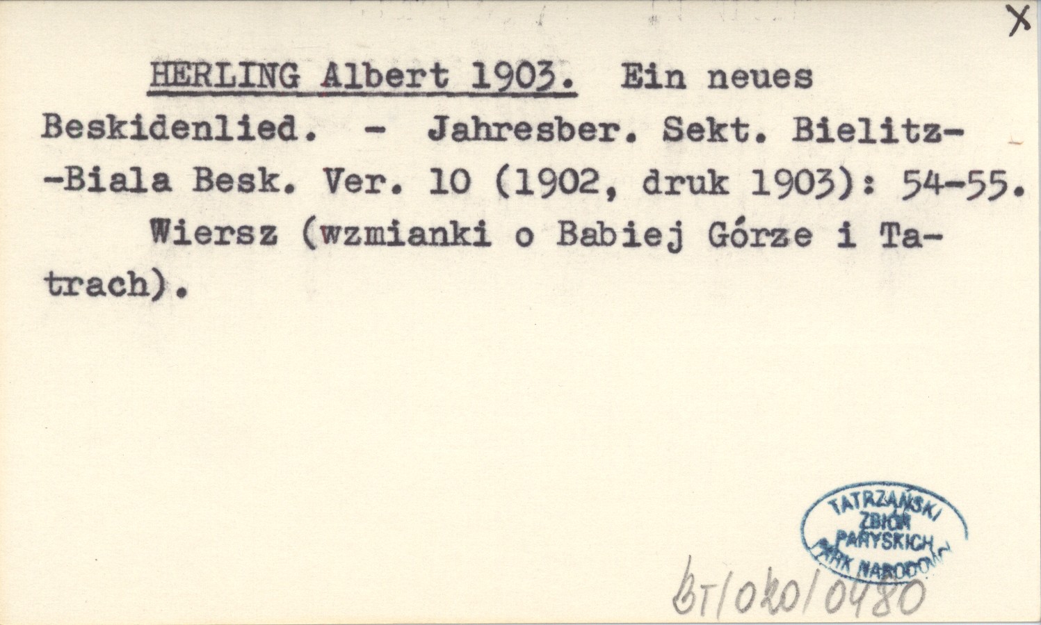Jahresbericht der Sektion Bielitz-Biala des Beskiden-Vereines, 10 (1092, druk 1902): 54-55. Wiersz (wzmianki o Babiej Górze i Tatrach).