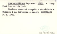 Projekt Digitalizacja fiszek z Bibliografi± Tatr i Podtatrza Witolda Henryka Paryskiego jest finansowany ze ¶rodków Ministra Kultury i Dziedzictwa Narodowego oraz Tatrzañskiego Parku Narodowego.
