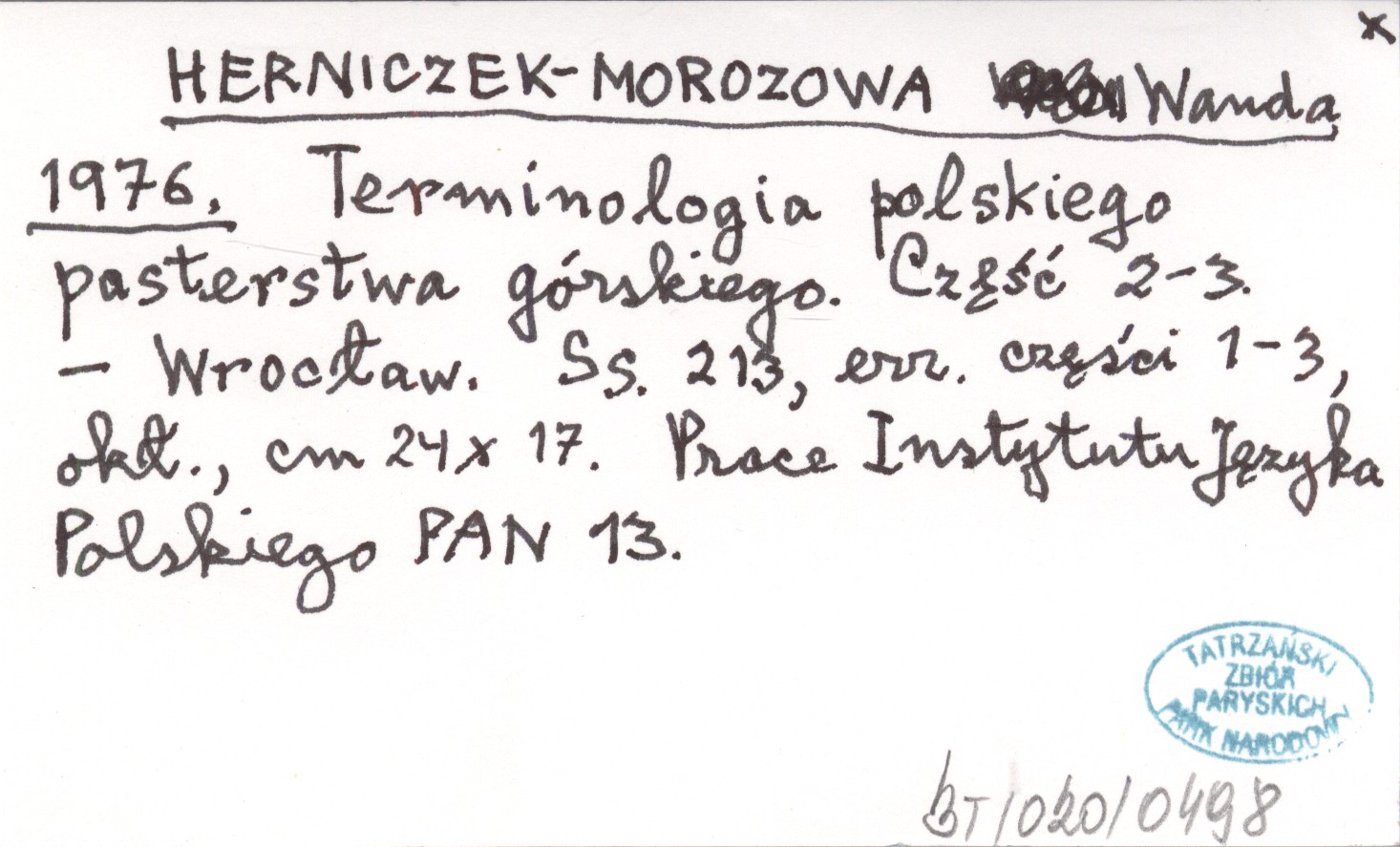 HERNICZEK-MOROZOWA Wanda 1976 Terminologia polskiego pasterstwa górskiego. Część 2-3.