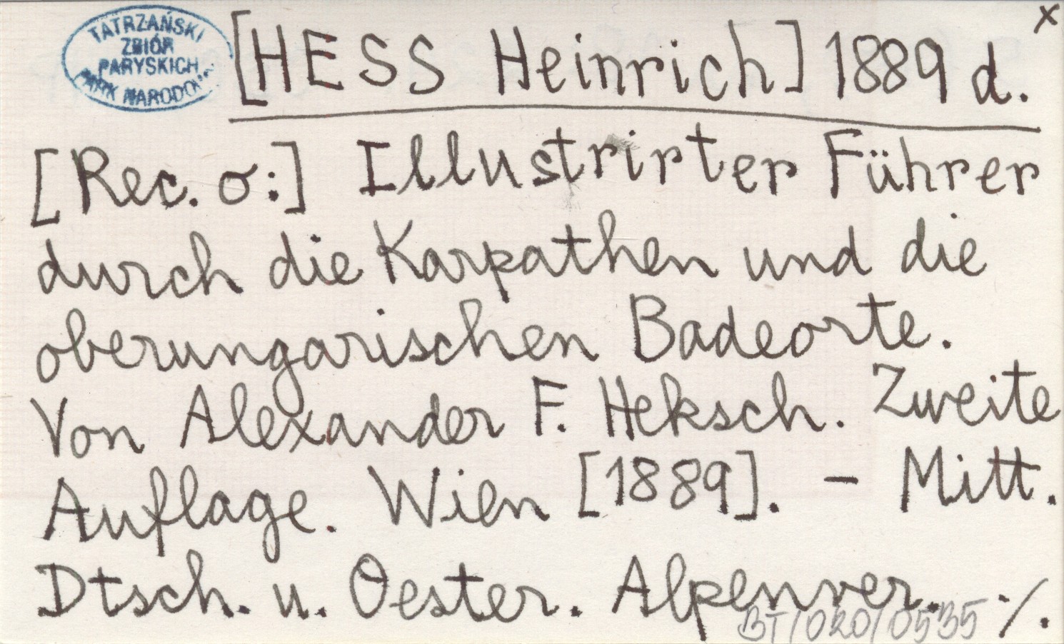 [HESS Heinrich] 1889 d Illustrirter Führer durch die Karpathen und die oberungarischen Badeorte. Von Alexander F. Heksch. Zwiete Auflage. Wien [1889].