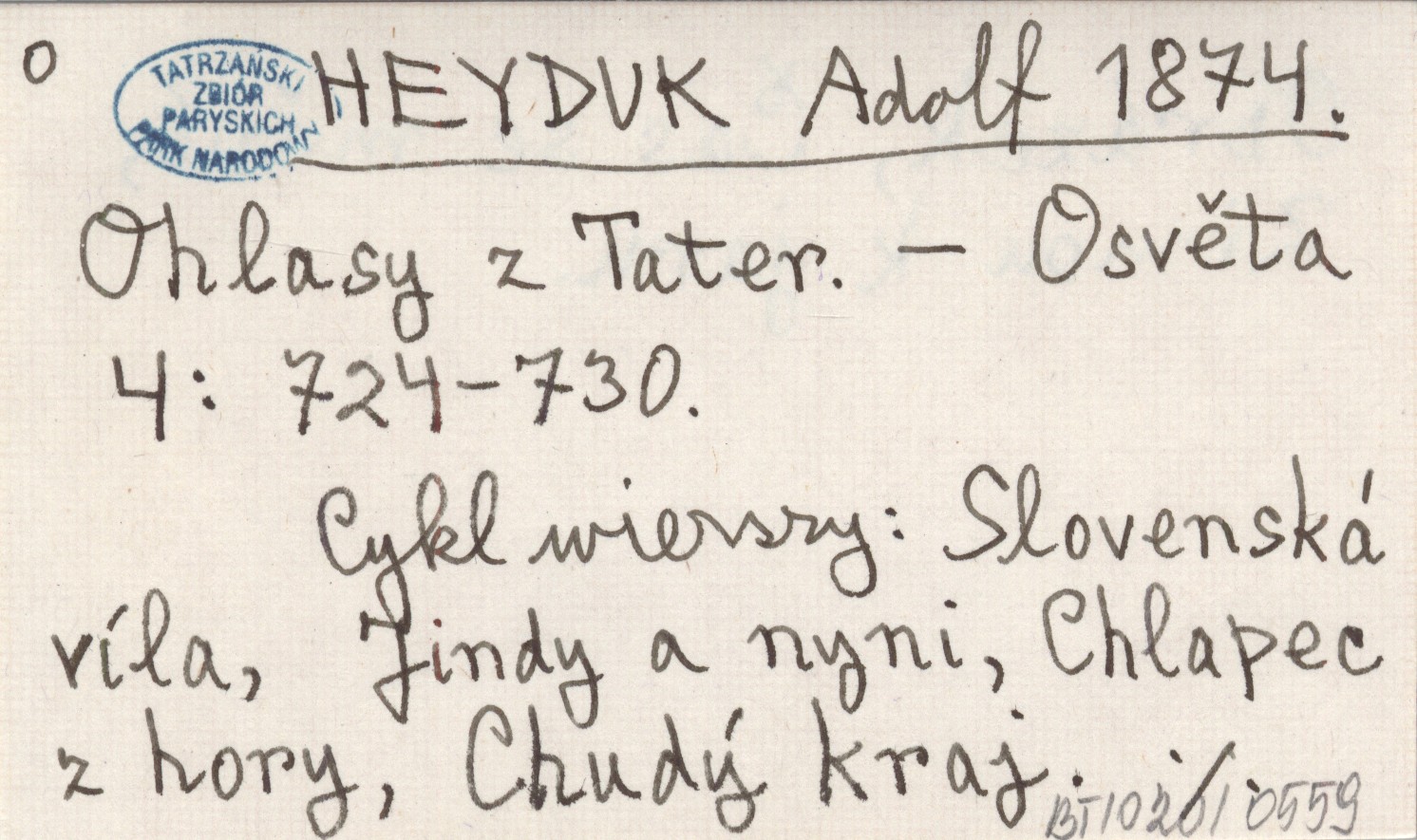 Osvěta, 4: 724-730. Cyk; wierszy: Slovenská víla, Jindy a nyni, Chlapec z hory, Chudý kraj, Obrázek, Čas se mění, Zimou k jaru.