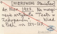 dr. Hier. [HIEROWSKI Stanisław] 1927 Na marginesie artykułu "Teatr w Zakopanem".