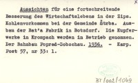 Aussichten für eine fortschreitende Besserung des Wirtschaftslebens in der Zips. Kohlenvorkommen bei der Gemeinde Štrba. Ausbau der Bat'a Fabrik in Botzdorf. Die Kupferwerke in Krompach werden in Betrieb genomnen. Der Bahnbau Poprad-Dobschau. 1936
