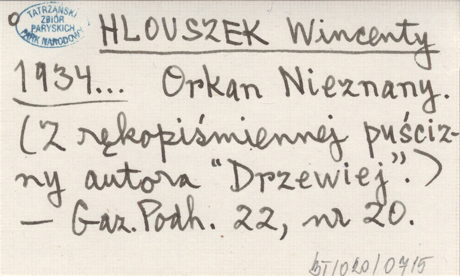 HLOUSZEK Wincenty 1934... Orkan Nieznany. (Z rękopiśmiennej puścizny autora "Drzewiej").