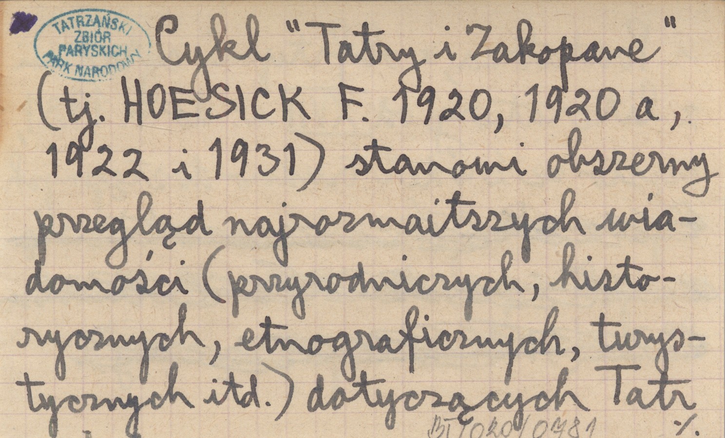 Cykl "Tatry i Zakopane" (tj. HOESICK F. 1920, 1902 a, 1922 i 1931) stanowi obszerny przegląd najrozmaitszych wiadomości (przyrodniczych, historycznych, turystycznych, itd.) dotyczących Tatr i Podtatrza, z obfitymi cytatami z literatury od XVII w. do r. 1931, często ze źródeł trudno dostępnych.