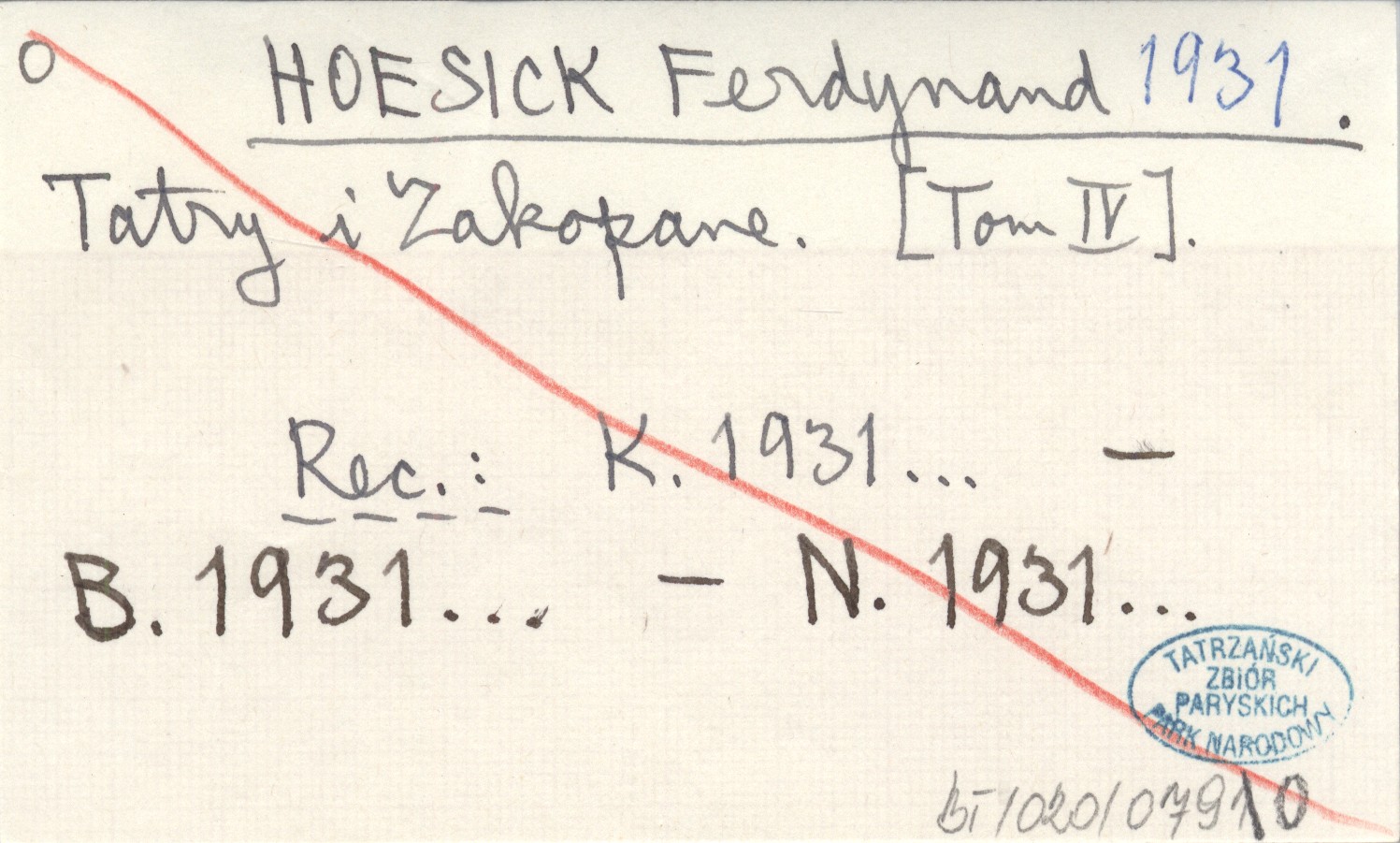 HOESICK Ferdynand 1931 Tatry i Zakopane. Przeszłość i teraźniejszość. Część czwarta. [Od r. 1960 do 1931].