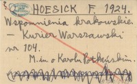HOESICK F. 1924 Wspomnienia krakowskie.