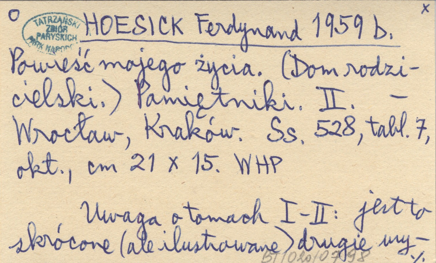 HOESICK Ferdynand 1959 b Powieść mojego życia. (Dom rodzicielski). Pamiętnik. II.