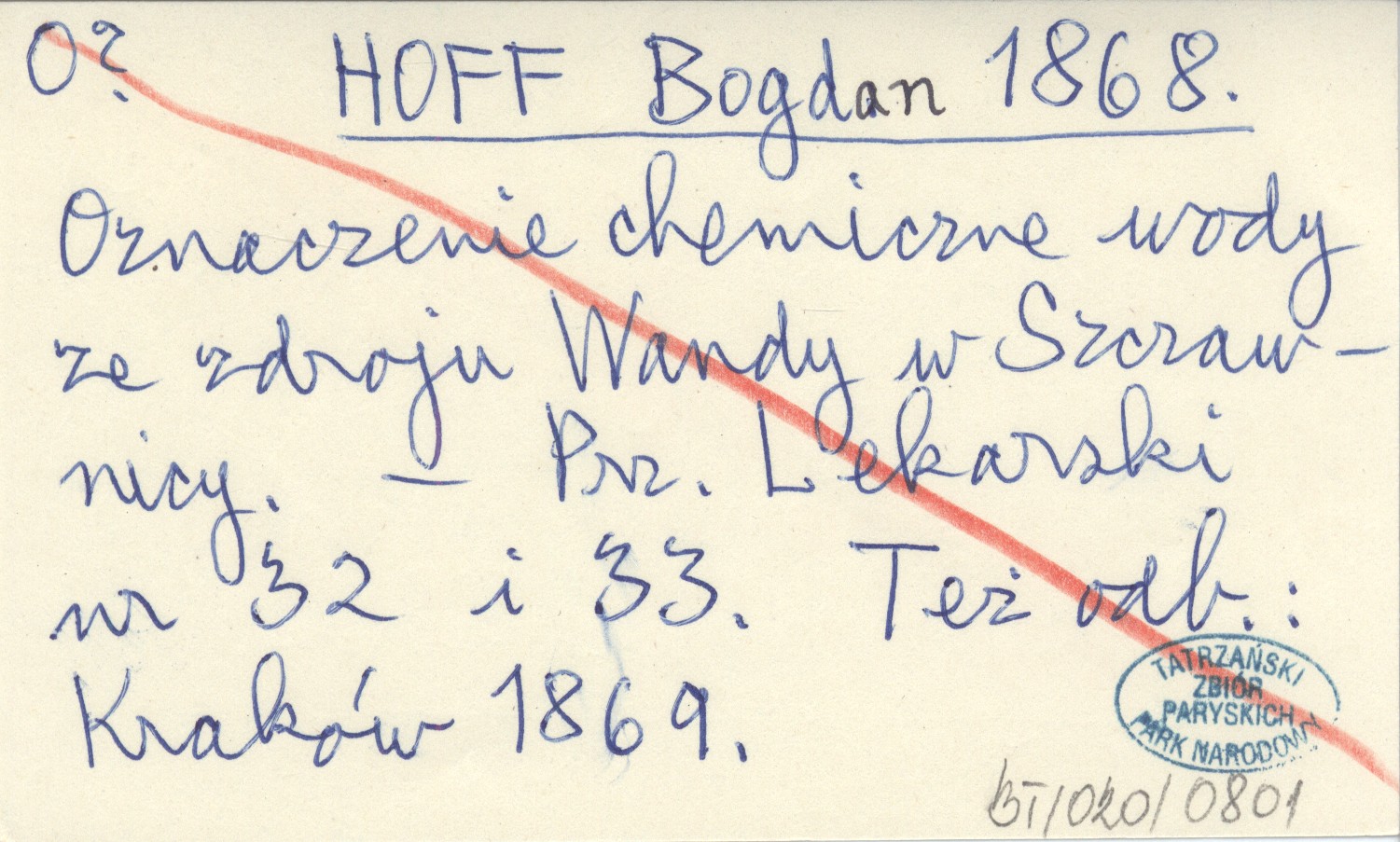 HOFF Bogdan 1868 Oznaczenie chemiczne wody ze zdroju Wandy w Szczawnicy.