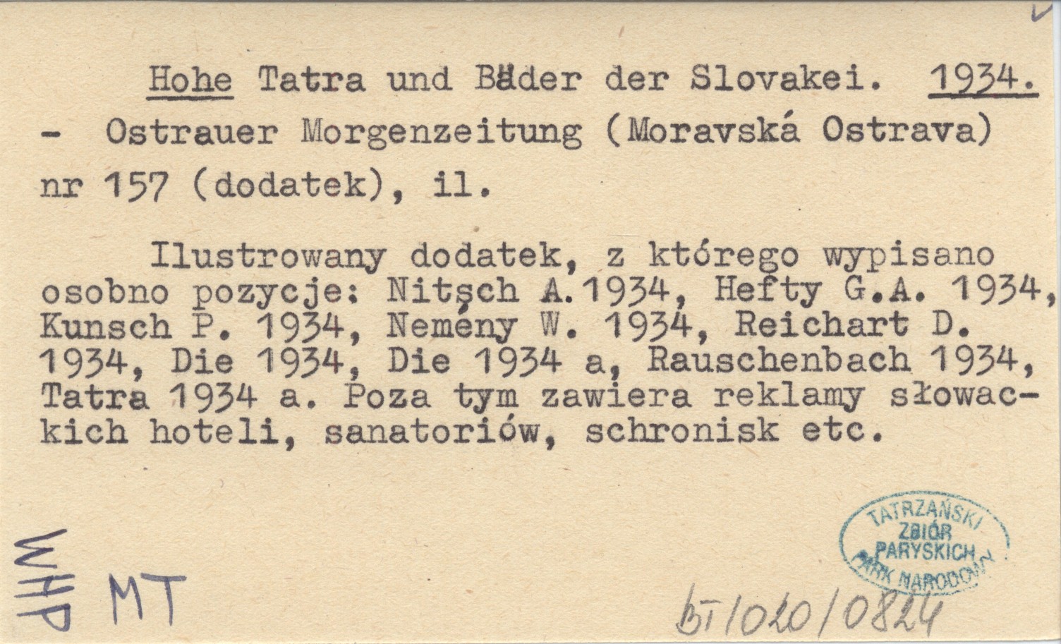 Ostrauer Morgenzeitung (Moravská Ostrava) , Nr 157 (dod.), il. Zawiera reklamy słowackich hoteli, sanatoriów, schronisk etc. Ilustrowany dodatek, z którego wypisano osobno pozycje: Nitsch A. 1934, Hefty G.A. 1934, Kunsch P. 1934, Nemény W. 1934, Reichart D. 1934, Die 1934, Die 1934 a, Rauschenbach 1934, Tatra 1934 a.