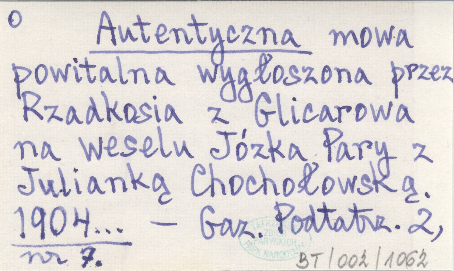 Autentyczna mowa powitalna wygłoszona przez Rzadkosia z Glicarowa na weselu Józka Pary z Julianką Chochołowską. 1904...