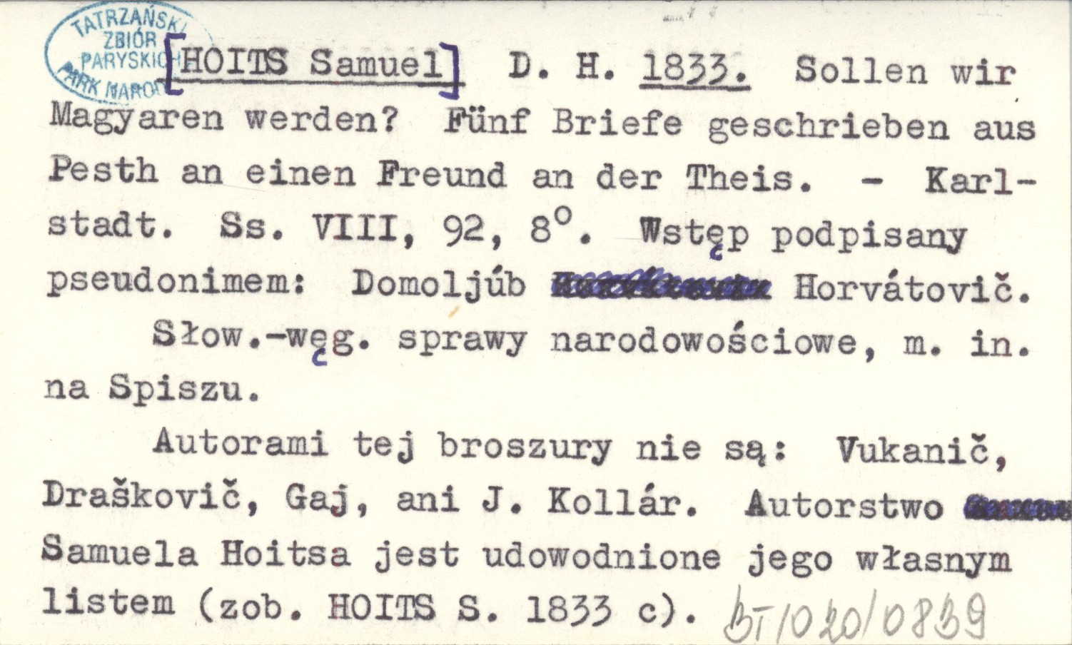 Karlstadt , VIII s., 92, 8°. Słowacko-węgierskie sprawy narodowościowe, m. in. na Spiszu. Wstęp podpisany pseudonimem: Domoljúb Horvátovič. Autorami tej broszury nie są: Vulkanič, Draškovič, Gaj, ani J. Kollár. Autorstwo Samuela Hoitsa jest udowodnione jego własnym listem (zob. HOITS S. 1833 c).