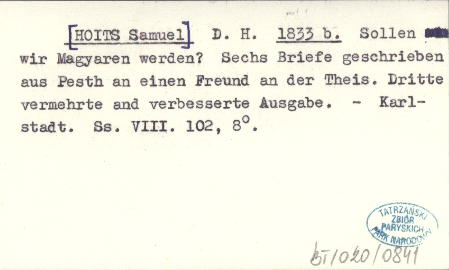 D. H. [HOITS Samuel] 1833 b Sollen wir Magyaren werden? Sechs Briefe geschrieben aus Pesth an einen Freund an der Theis.