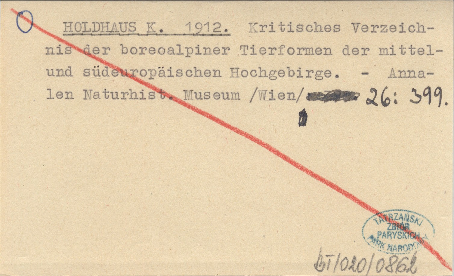 HOLDHAUS K. 1912 Kritisches Verzeichnis der boreoalpiner Tierformen der mittelund südeuropäischen Hochgebirge.