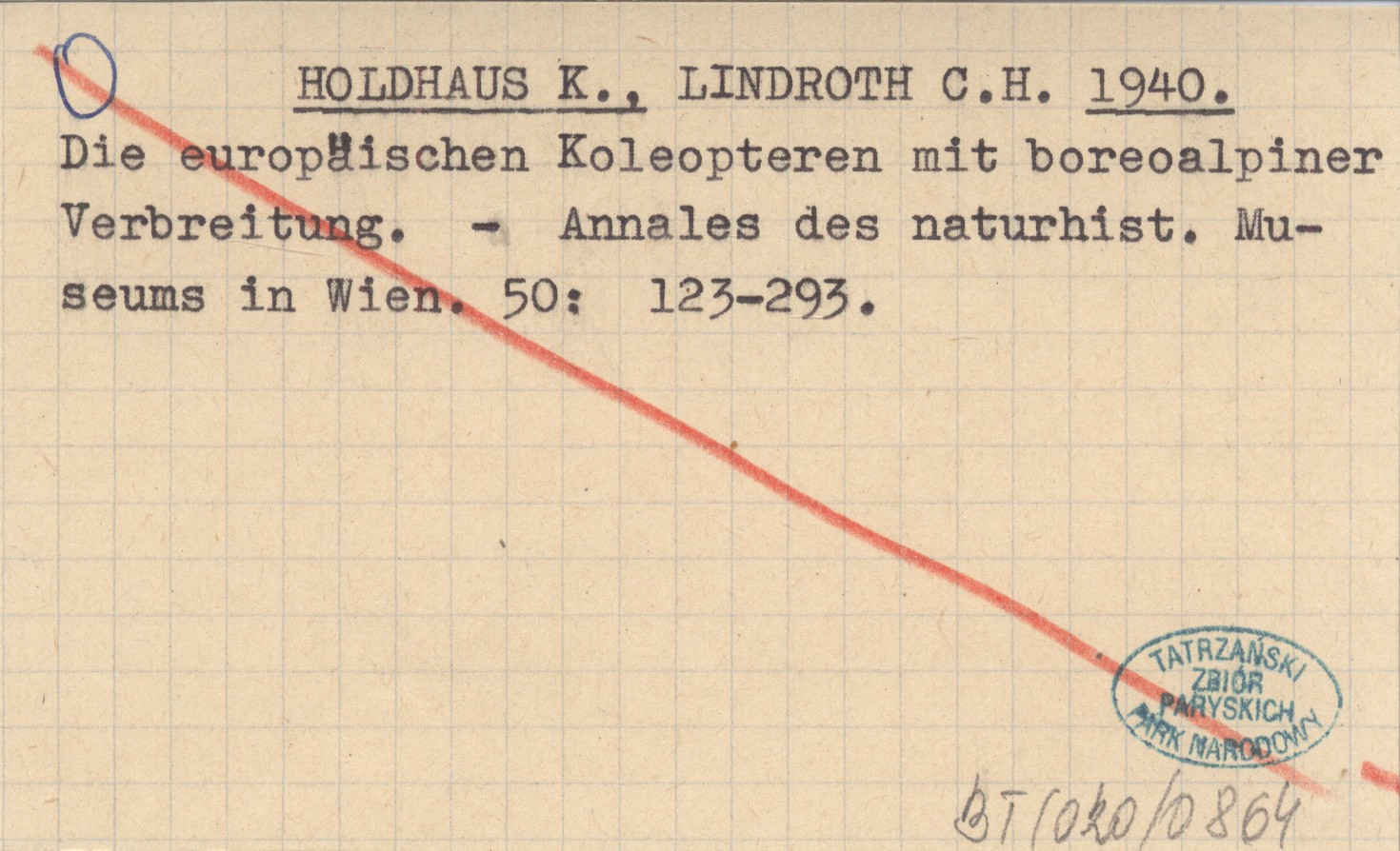 HOLDHAUS K. LINDROTH, C. H. ; 1940 Die europäischen Koleopteren mit boreoalpiner Verbreitung.