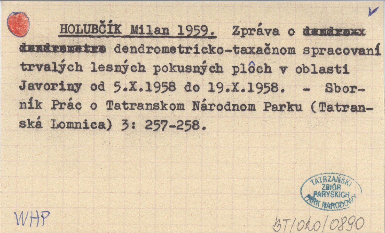 HOLUBČÍK Milan 1959 Zprávka o dendrometricko-taxačnom spracovaní trvalých pokusných plôch v oblasti Javoriny od 5.X.1958 do 19.X.1958.