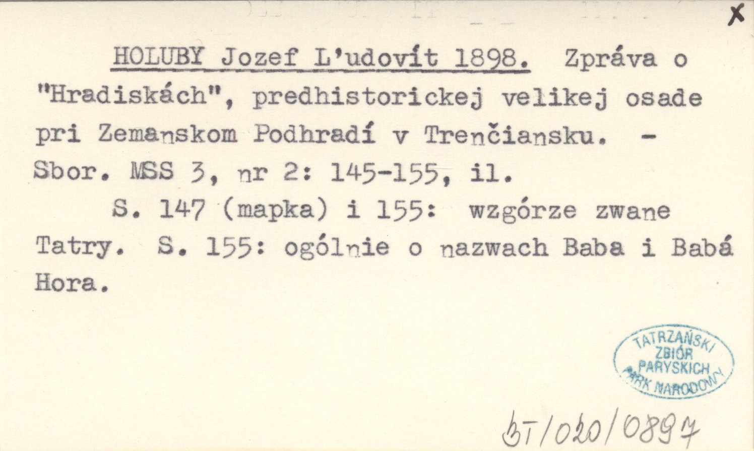 Sbor. MSS, 3, nr 2: 145-155, il. S. 147 (mapka) i 155: wzgórze zwane Tatry. S. 155: ogólnie o nazwach Baba i Babá Hora.