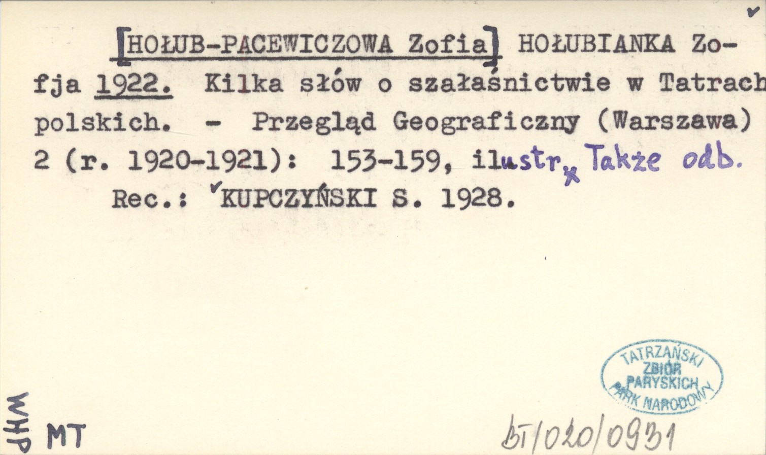 HOŁUBIANKA Zofja [HOŁUB-PACEWICZOWA Zofia] 1922 Kilka słów o szałaśnictwie w Tatrach polskich.