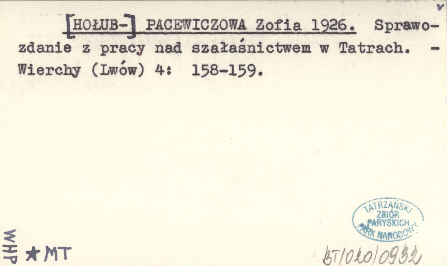 [HOŁUB-] PACEWICZOWA Zofia 1926 Sprawozdanie z pracy nad szałaśnictwem w Tatrach.
