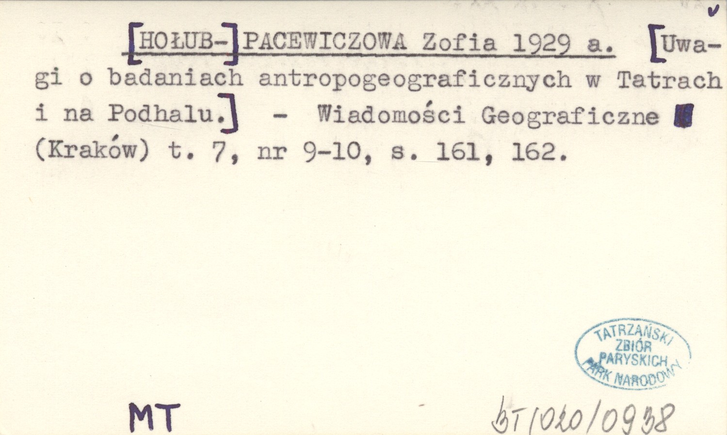 [HOŁUB-] PACEWICZOWA Zofia 1929 a [Uwagi o badaniach antropogeograficznych w Tatrach i na Podhalu]/