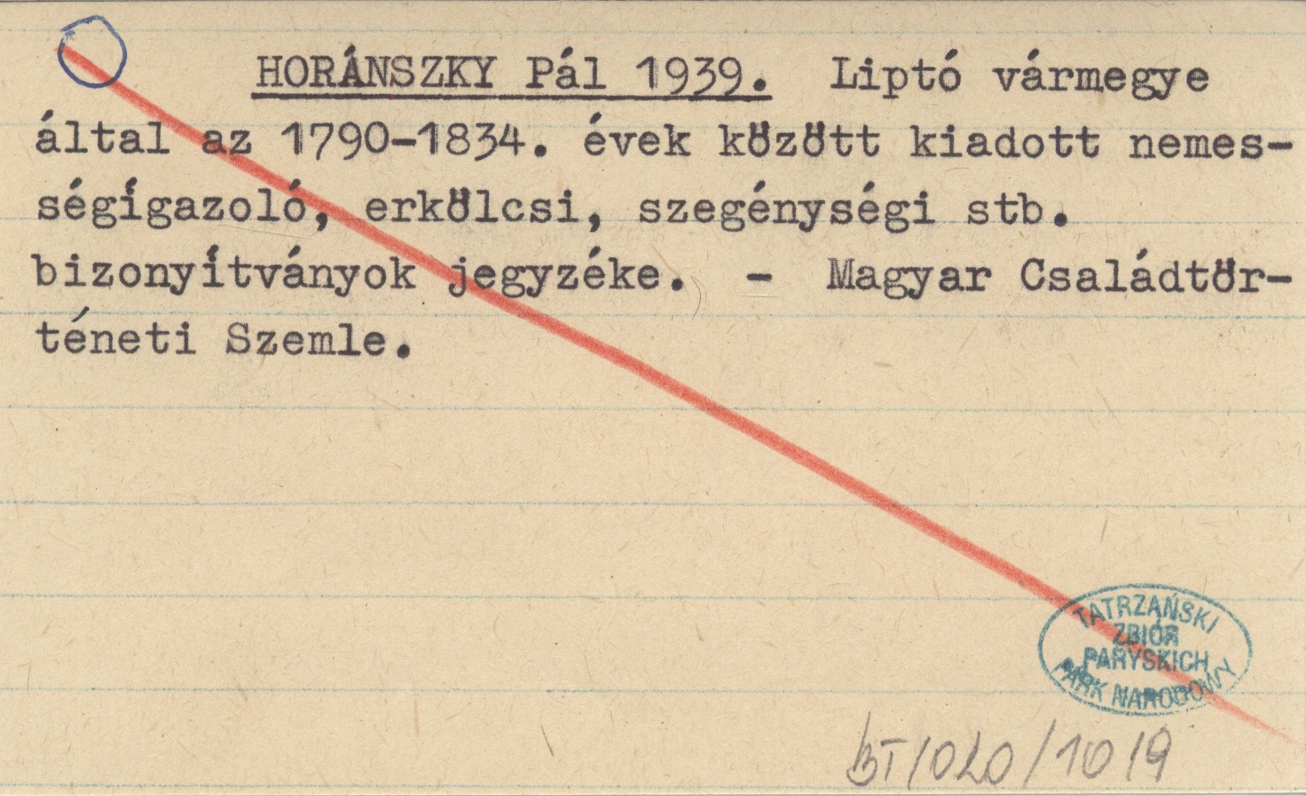 HORÁNSZKY Pál 1939 Liptó vármegye által az 1790-1834. évek között kiadott nemességígazoló, erkölcsi, szegénységi stb. bizonyítványok jegyzéke.