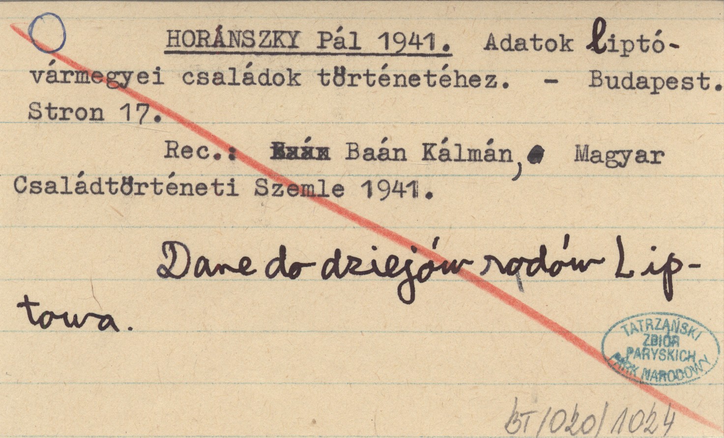 Budapest , 17 s. Dane do dziejów rodów Liptowa. REC: Baán Kálmán, Magyar Családtörténeti Szemle 1941.