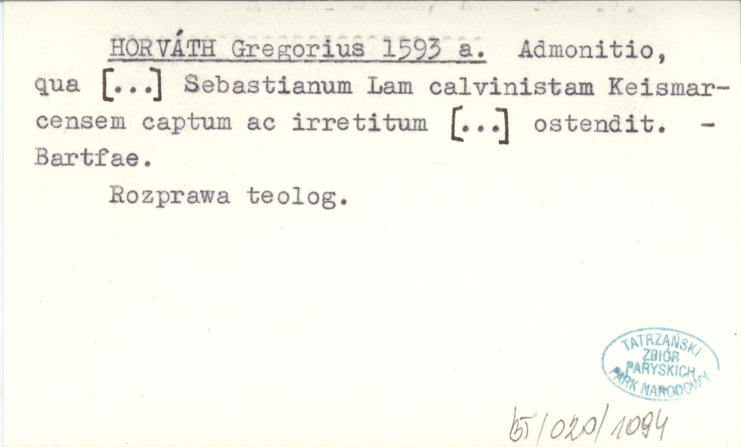 HORVÁTH Gregorius 1593 a Admonitio, qua [...] Sebastianum Lam calvinistam Keismarcensem captum ac ittetitum [...] ostendit.