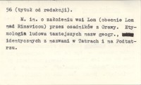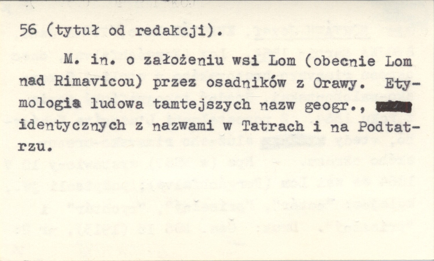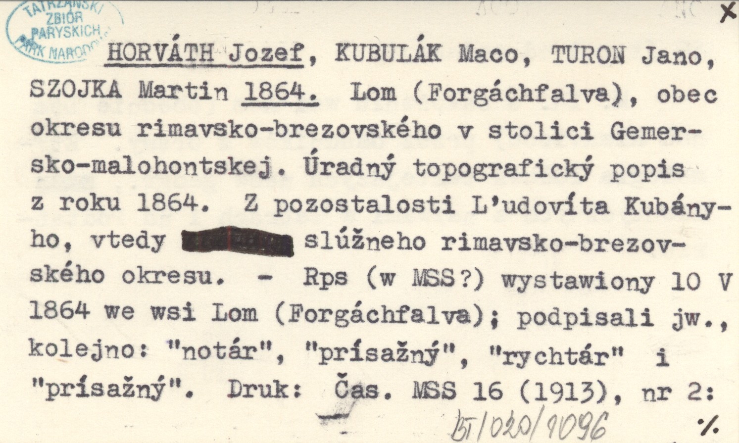 , M. in. o za³o¿eniu wsi Lom (obecnie Lom nad Rimavicou) przez osadników w Orawy. Etymologia ludowa tamtejszych nazw geograficznych, identycznych z nazwami w Tatrach i na Podtatrzu. Rêkopis (w MSS?) wystawiony 10 V 1864 we wsi Lom (Forgáchfalva); podpisali jw., kolejno: "notár", "prísa¾ný", "rychtár" i "prísa¾ný". Druk: Èas. MSS 16 (1913), nr 2: 56 (tytu³ od redakcji).
