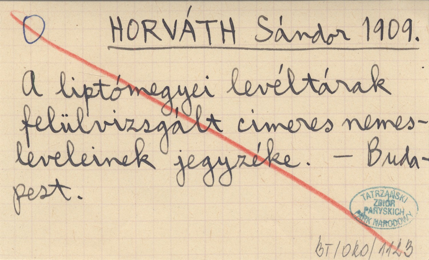 HORVÁTH Sándor 1909 A liptómegyei levéltárak felülvizsgált cimeres nemes leveleinek jegyzéke.