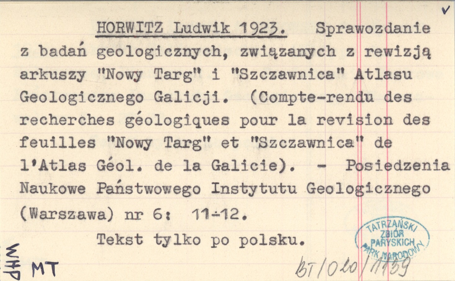 HORWITZ Ludwik 1923 Sprawozdanie z badań geologicznych, związanych z rewizją arkuszy "Nowy Targ" i "Szczawnica" Atlasu Geologicznego Galicji. (Compte-rendu des recherches géologiques pour la revision des feuilles "Nowy Targ" et "Szczawnica" de l'Atlas Géol. de la Galicie).